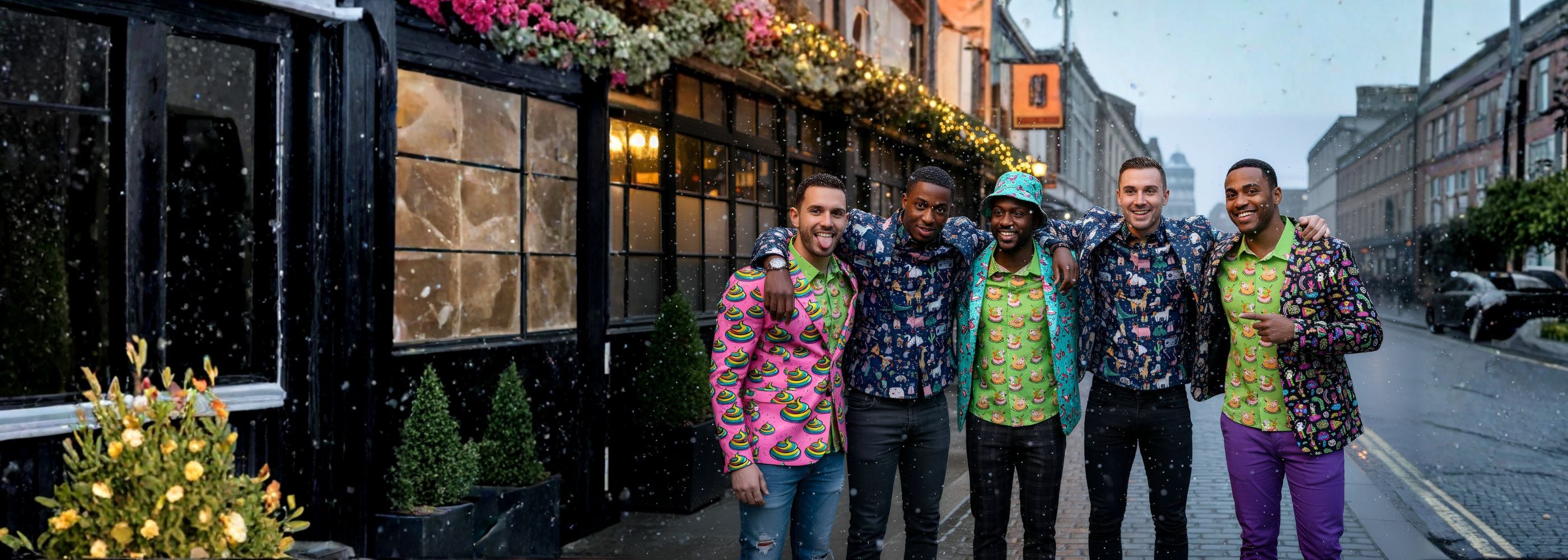 Chasing that beach-party energy? Lean into the tropical side of shit shirts Christmas style. Go with light shorts, fresh trainers, and shades. Stick to block colours that pick out tones from your shirt, and avoid mixing too many prints unless you’re proudly aiming for the worst Christmas shirt trophy.