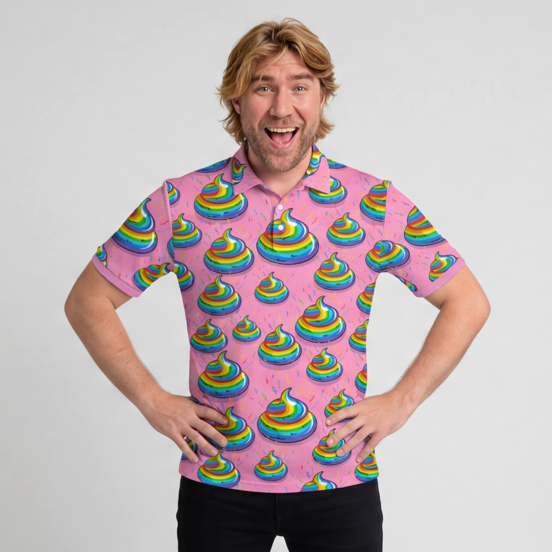 The pattern on this shirt is a riotous tribute to the Bad Shirt Club movement. Set against a vibrant candy pink base, the fabric is covered in a seamless repeat of rainbow swirl poop emojis that transition through a spectrum of deep purple, electric blue, lime green, and fiery red. These colourful characters are surrounded by a chaotic spray of confetti like sprinkles in yellow, red, and blue, making the entire garment look like a walking celebration. This is a loud and unapologetic design that grabs attention and refuses to let go.
